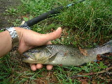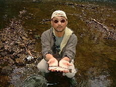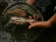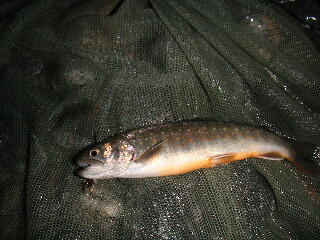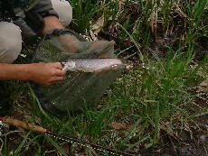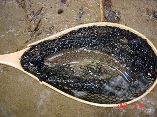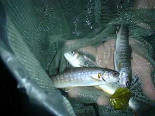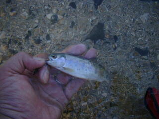 | 梅雨の中休み蒸し暑い長野。前日の雨のせいか、河川工事のせいか犀川は泥にごり!そこで、高瀬川とその支流に赴く。高瀬も多少濁りはあるものの大丈夫!水の中が気持ち良い!重く早い流れに任せ釣り下がる。1kmほどウェーデング限界最下流で志田・斎須両氏がニジマス・ヤマメ・ウグイなどをゲット。その後、ライズ待ちの川に向かう。指定されたプールはすでにライズが始まっており、#18 ロイヤルウルフ・アントなどで新生イワナをゲット!川にはエサが多く岩を裏返すとヒゲナガがびっしり!ピューパ化したものや、すでに空のものもあった。環境はバッチリと見た!後は腕か・・・。maji |