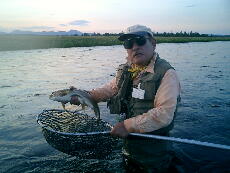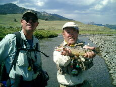 | 03年モンタナ日誌 6年目になる、モンタナ日誌です。今回は久しぶりに入ったイエローストーン公園内の自然と釣りに触れてみました。また、2度目となるヘンリーズフォーク釣行記、やっぱりこの流れは魅力的でした。7月17日(木)イエローストーン公園内 スルー、ソーダビュート 晴 気温28度水温15度 9時〜18時本日のガイドはトム。7時きっかりにデザートインの前に来てくれた。ちょっとインテリっぽい感じの男。今日は公園内の川にチャレンジしたい。1昨年はイエローストンリバーでカットスロートのいいライズの釣りが出来た。忘れもしない午前11時からきっかり1時間のグレイ・ドレイク12番のスピナーの釣りだった。そんな話をするとトムは今年はスルー・クリークだという。スルー・クリーク・・・。あの佐藤成史さんの名著『ロッキーの川、そして鱒たち」に出てくる、あの美しい川だ。まさか今あの川に行けるなんて・・・、もちろんオーケイした。公園の入口が混まないうちにということで、7時30分にはゲートを通過し車を走らせる。いつもながら空き缶はもちろんゴミひとつ落ちていない公園は美しい。10ドルを払って入るからなのだろうか、同じ国立公園の富士山が世界遺産の候補地にも落選したのはゴミの多さだと言われているが本当に日米の自然に対する民度の差には歴然とさせられる。公園内の道を走りながらバッファローやエルクにあったり、プレイリードッグやクマの親子に会ったり、そして山火事を発見したりと飽きることがない。落雷が原因で起きる山火事は自然に消えるまでそのままだという。触らない、いじらないというのがこの公園のルールだ。公園内を流れる川も、もちろんそうだ。目の前に現れたスルー・クリークはあの写真の通りの美しく、静かな流れ。トラウトたちはバンク際を時たまライズし、上下流に動き回っているとトムは教えてくれる。その行動の先を読んでキャストしろということだ。フライはブラックビートルにグレイ・ドレイク・ダン14番やPMD。トムは対岸のバンクの上から身を隠しながら、あっちだこっちだと指示してくれるが、静かな流れでなかなか難しい。やっとのことでちびニジマスを1匹。風も出てきてライズもなくなり、午後からは近くのラマーリバーの支流、ソーダ・ビュート・クリークに移動した。この川は近くで野生のバッファローがのんびりと草を食んでいるような場所だ。遠くの山並みはまだ雪が残ってちょっと荒涼としたした感じ、行ったことはないが写真で見たアラスカかチリのパタゴニアのようだ。速い流れの流芯とその開き、そしてバンク際を丁寧に釣り上がる。なかなかうまくヒットしない。グラスホッパーとブラックビートルでカットスロートの17インチをやっと1匹。終わって大事なことに気がついた。カットスロートの釣りは何といっても遅合わせ!フライに飛出し、1,2,3で合わせて丁度いい。どうも苦戦すると思っていたらこんな大事なことを忘れていた。それにしても本当に美しい川と山並み、まさかここまで来れるとは思いもしなかったので心から満足。本当にこの公園は美しい!7月18日(金)ヘンリーズ・フォーク 晴 気温28度水温19度 10時〜12時、17時〜21時モンタナ州のWY(ウエストイエローストーン)でレンタカーを借り、ほぼ一本道を40分も走るとアイダホ州のラストチャンスに着く。フライフィッシングの聖地、ヘンリーズフォークが目の前だ。新装なったトラウトハンターは店も広くなり、ロッジ、バー、レストランと落ち着いた雰囲気がなかなかだ。テラスの前がラストチャンスで言うことなし。今日のガイドはELI(イライ)オフシーズンは学生をしている3年目のガイドだ。父親がこのヘンリーズフォークを含むハリマンステートパークのレンジャーをしていて、イライもこの川のことは隅から隅まで知っているという。言葉数は少ないがなかなか頼りになりそう。まず、ラストチャンスのお立ち台から下流、いわゆるレイルロードランチに入る。ここからのハリマンステートパークに入るには74ドル支払う必要がある。今年は水温が高くてライズも少ないという。イライとライズを探して下る。彼らは小さなサイズのライズには目もくれない。そして10分、背びれを揺らして小さなライズを繰り返すレインボーを発見。心を躍らせ、ライズの上流45度にたち込む。フライはラスティーのPMDスペント16番。3投して、ライズは止まった。流れには小さな縒れがあって難しい。諦めて、左岸に上がりボーンフィシュ・フラット近くまで、20分くらい下るがライズなし。とにかく歩く、そして目を凝らしてライズを探す。足で釣る釣りだ。結局、12時過ぎ午前の釣りは諦めてトラウトハンターまで戻って、テラスでランチ。目の前の流れと風が最高だ。5時まで休んで、オズボーンブリッジの下流、ラストチャンスよりもゆったりとした流れのパイニーポイントに入る。静かな流れでいい感じ。これもひたすら歩く。ライズを探して30分は下る。そ
