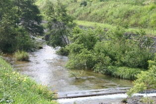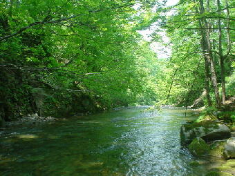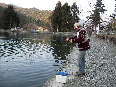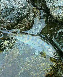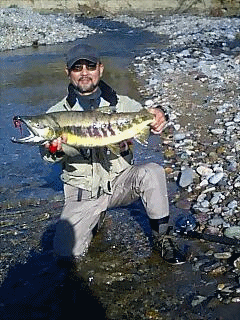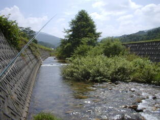 夕方は、釣堀の上流・禁漁区手前のポイントがお勧めです。昼間は、ヤマメですが夕方からは、大型のレインが出ます。