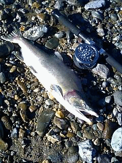 | 10月から標津町の一部河口でのサケ釣りが解禁になり、浜辺にキラキラと銀鱗が輝いていた。羅臼岳では初冠雪という寒さも本格的になっているにもかかわらず、今年は10月9日からの嵐で定置網が崩壊し、この時期にしては大型が残っていた。久々の強烈な引きと走りに手が震えてしまった。ここでしか使いようの無い竿達もサーモンファイトにしっかり対応して、心なしか喜んでいるようでもあった。 間地記 |