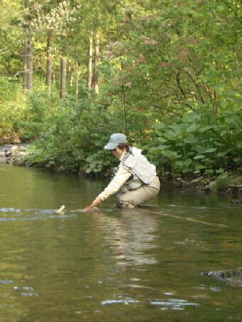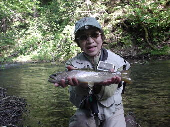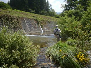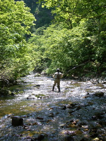 狙い目=大場所は捨てて小さいポイントをこまめに積極的に狙うと20〜25くらいのヤマメに出会えます。フライは、14〜18のメイフライ(ボディーがイエロー・ブラウン系)でOKでした。