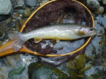 魚影は、解禁時に比べれば少ないと思いますが約1`釣り上がってヤマメ大小入れて(15〜25p)5匹ならまあまあッてとこではないでしょうかと思います。(釣れたヤマメは、去年稚魚放流されたものか?生まれたものか?解りませんが野生化していてかなり暴れます)