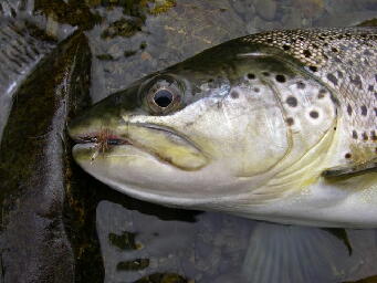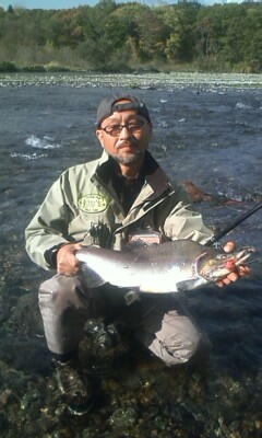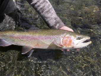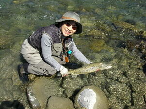 2日目の川はブラウンとレインボーが混生していました。数はまあまあだったのですが、サイズ的には6ポンドが最大。もちろん、もっと大きなトラウトもいたんだけど、スプークしたりファイト中にバラシたりで、ランディングできず。とほほ、です。