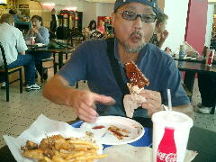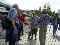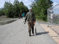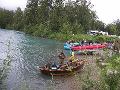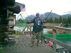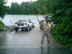 フェリーで対岸に渡る(1人6$)3mおきにアングラーが立つ。コレをコンバットフィッシングというらしい!アラスカは釣り師のための施設が充実している。川には階段・歩道・さばき用のテーブルなどが設置されている。ライセンスやタックルや捕獲数などのチェックも厳しい!スレは必ずリリースしなければならない!腰には拳銃を持っている!