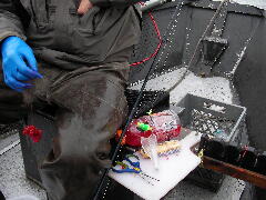 どうも怪しい色と強度のイクラ(筋子)を2本針につけて1ボートで4本ロッドで流し ひたすらあたりを待つ。水温7℃。気温10℃。小雨。6時間。キングとのやり取りではなく寒さで手がしびれる。